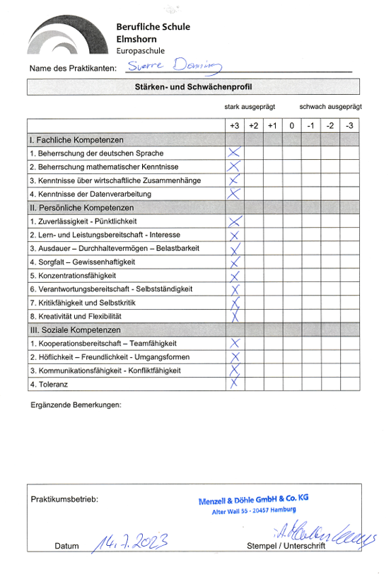 Nach dem Praktikum war der Praktikumsleiter äußerst zufrieden mit meiner Leistung, aber da die Firma leider keinen Platz für Azubis hatte musste ich meine Suche anderswo fortsetzen. Diese Suche hat mich jetzt hier nach Barmstedt und die umliegende Gegend verschlagen, wo ich mir im Jahr 2026 dann hoffentlich bei Ihnen einen Platz sichern werde!